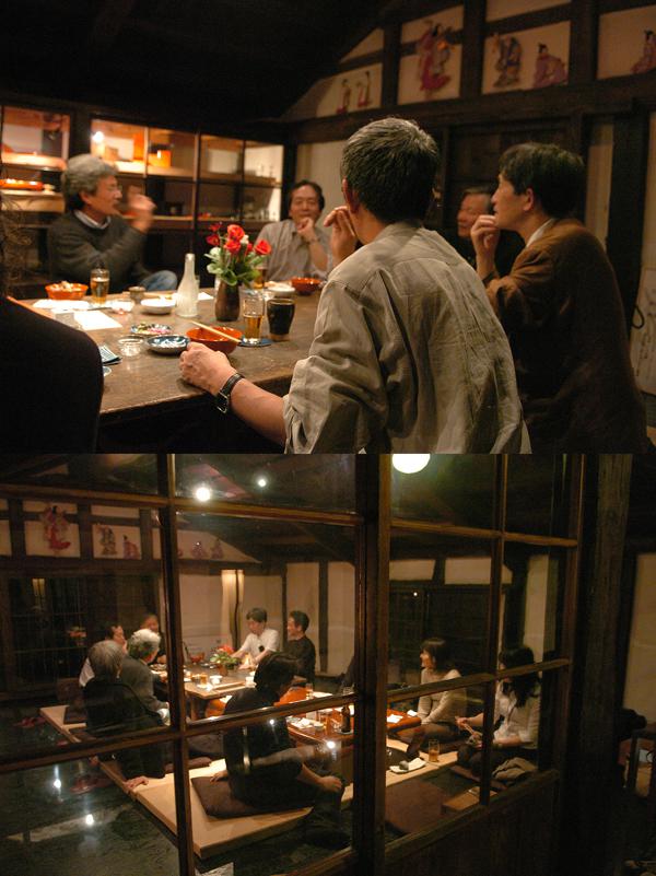 ■写真上:シンポジウム『神秘の樹と明日の鳥たち』の打ち上げ風景。会場はかつて芸工大がリノベーションを手がけた「蔵 オビハチ」。左から西雅秋氏、赤坂憲雄教授、酒井忠康氏(後ろ姿)、松本哲男学長、詩人の吉増剛造氏
