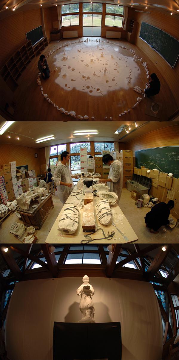 大地に落下した『CASTING IRON』が朝日町立木地区を賑していた一方で、旧立木小学校の校舎の中では、西雅秋さんと本学建築・環境デザイン学科生との共同制作による展覧会『彫刻風土-ASAHIMACHI'06-』が静かにオープンしていました。