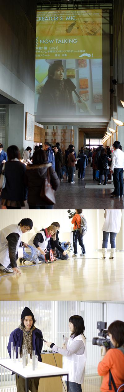 〈クリエイターズ・マイク〉…523名の出品学生全員が、作品の前で自作を解説するリレー形式のプレゼンテーション。全17会場を1本のマイクがめぐり、インタビュアーとの対話は本館1Fの大スクリーンに中継された。