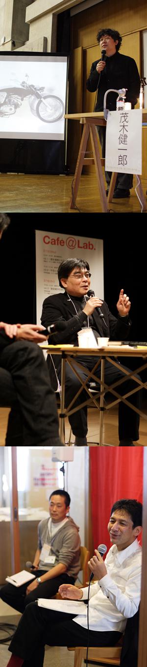 ■写真下:同じく「カフェ@ラボ」で環境デザイン学科は東北大学の小野田泰明氏(右)をゲストに迎えた。対談の相手は「みかんぐみ」の建築家で、本学の竹内昌義助教授(左)。