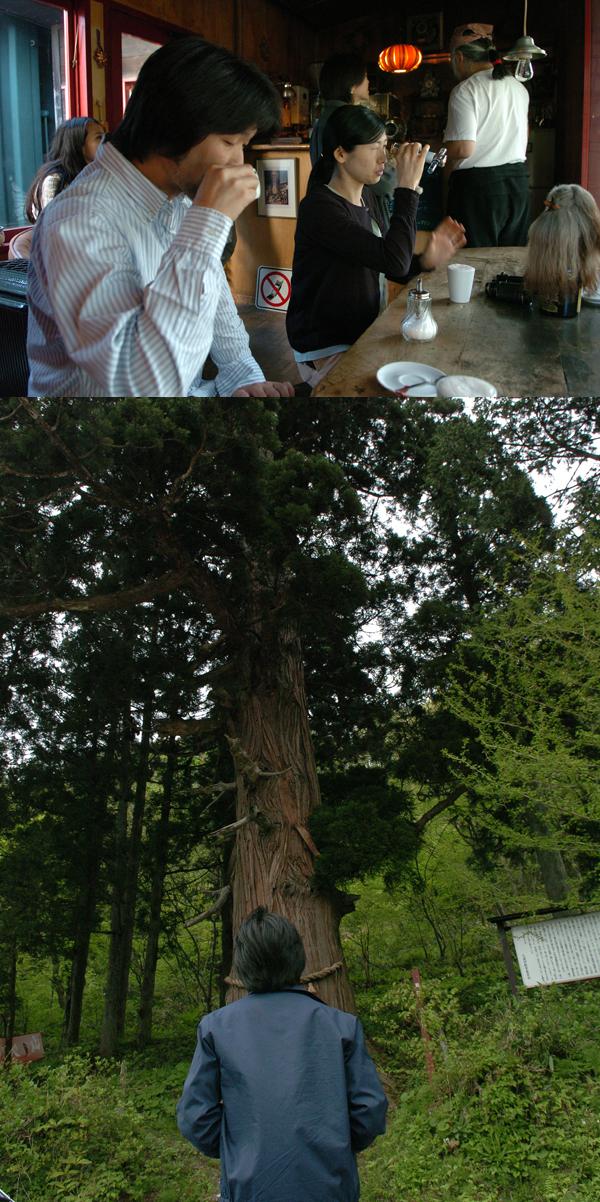 ■写真下:肘折温泉郷への道中にある日本最大級の杉の巨木「クロベ」の前で。大蔵村在住の舞踏家・森繁哉さんのラブコールで、立花さんの山形ロケハンは大蔵村に飛び火。
