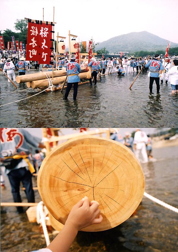 宇治橋から1キロほど下流の浅瀬から、若衆による木遣音頭に導かれて、木曽で切り出された大きな檜の丸太が五十鈴川をゆっくり溯上してきます。