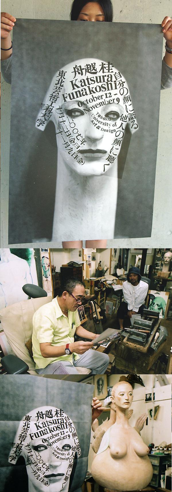 ■写真上:先週刷り上がったばかりの立花文穂さんデザインによる『舟越桂 自分の顔に語る/他人の顔に聴く』展ポスター。田宮印刷株式会社(山形市)に協力を依頼し、インクの盛りや印刷用紙の微妙なニュアンスにこだわったりと、職人的な試行錯誤を繰り返しながら、立花さんのタイポグラフィーと舟越作品が見事に融合しました。お2人のコラボレーションともいえるポスターです。