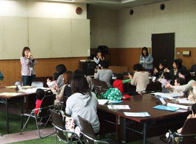 の皆さんによる手遊びや紙芝居が始まると、お母さんやおばあちゃんと
