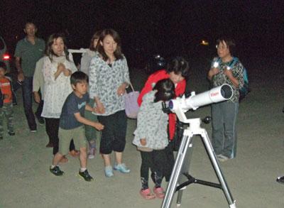 ▽天体望遠鏡の後ろに長蛇の列!順番を待つ人は夜空を見上げています。