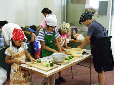 照りつけるチャレンジふぁーむで元気に収穫した野菜を使い、小学生が