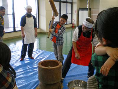 慣れないながらもヨイショ、ヨイショと楽しそうに餅をつきます。