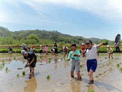 プラン市民農場の皆さんに教えていただきながら、さっそく田植えを体験