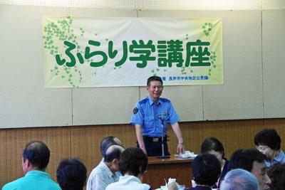講師は長井警察署あやめ交番所長 佐藤 昌幸 氏。平日の日中の開催にも