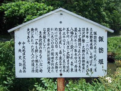 諏訪堰の名は、正式には「浅立広野用水堰」と呼ばれ、慶長10年(1605)に