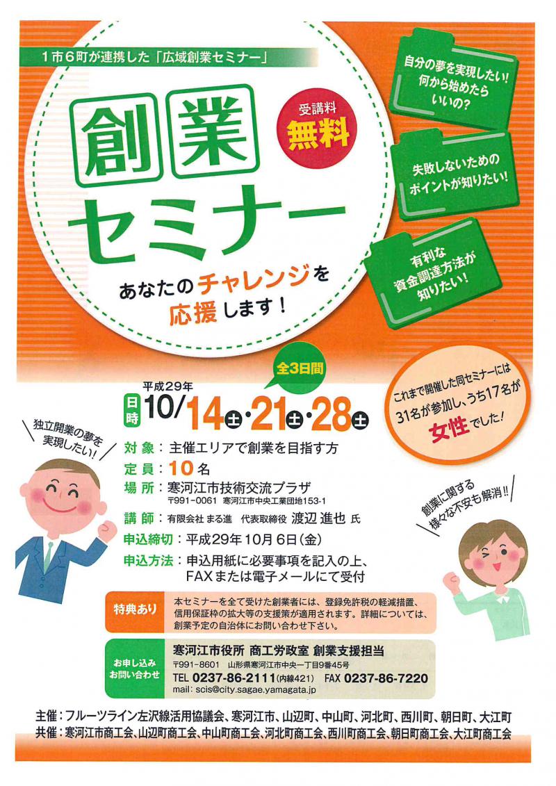 寒河江市、山辺町、中山町、河北町、西川町、朝日町、大江町で創業を目指す方を対象に、創業に向けたセミナーを開催します。