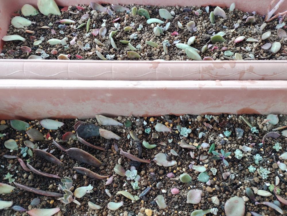 ほとんど休眠中の多肉ちゃんたちですが、葉挿しの子たちも