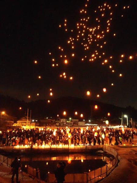 ランタンや花火が、あえて水面に映るよう、構図にこだわって撮影したとのことです。狙い通り、ランタンの灯りや大きな花火が夜空と水面の両方に映えて感動的です!
