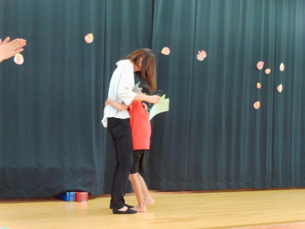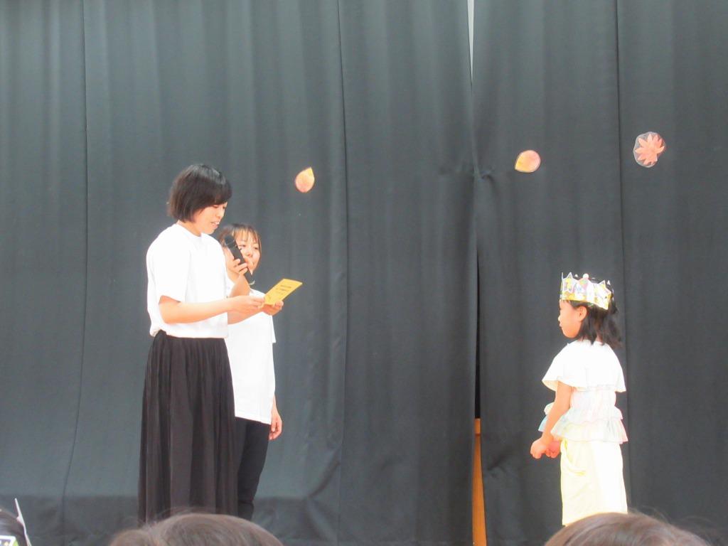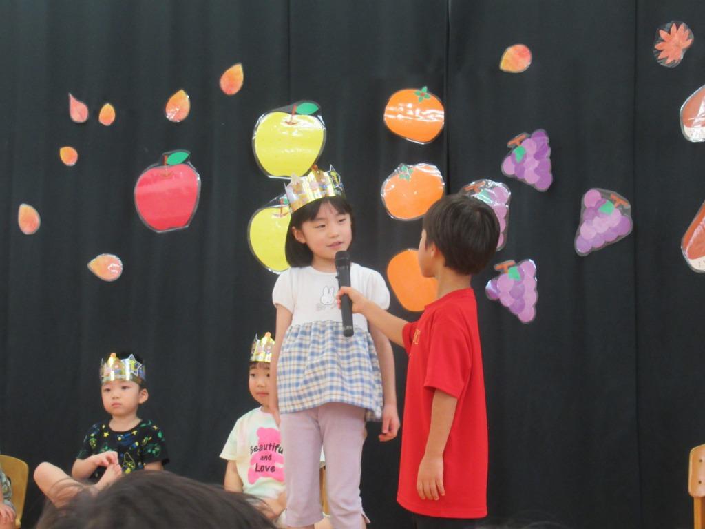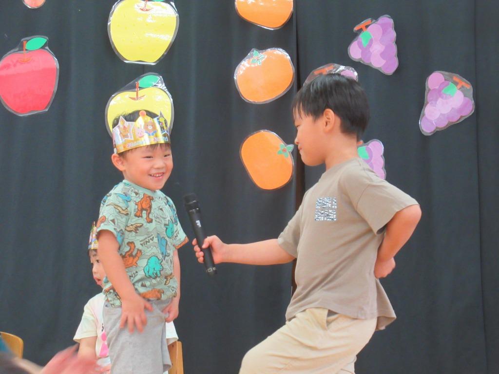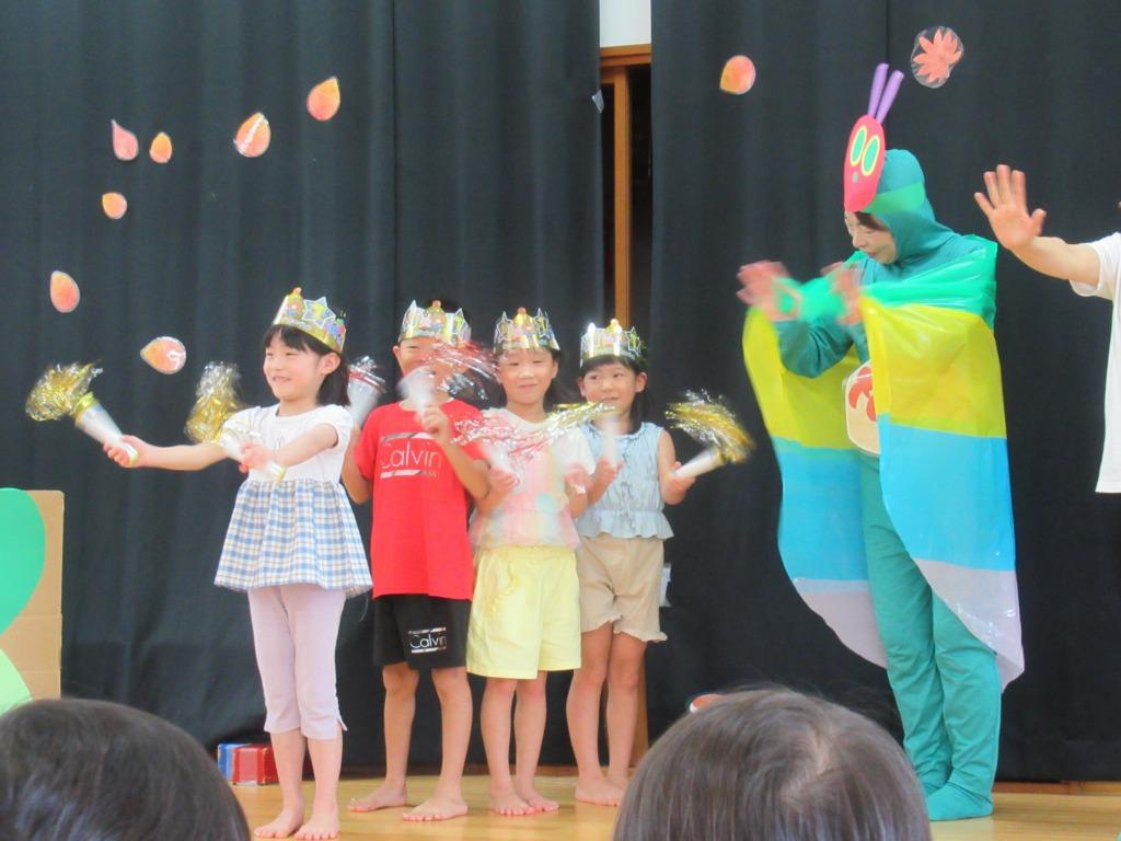 9月10日(水)9月生まれの誕生会が行われました。ステージに立つ前の子どもたちは「ぼくのママきてる」「ドキドキするー」とちょっぴり緊張気味です。誕生児の子どもたちは、インタビューに応えたり、鉄棒、大繩跳び、ブロック、絵や文字を書いた作品など様々な得意なことを発表してくれました。職員による出し物では「きせつはずれのはらぺこあおむし」の劇です。年長組の誕生児も劇を手伝ってくれ盛り上げてくれました。最後は誕生児(年長児)の保護者の方から子どもたちにお手紙を読んでいただくと、感激した子どもたちは大好きな保護者の方と抱き合い笑顔が輝いていました。9月生まれのお友達お誕生日おめでとうございます。