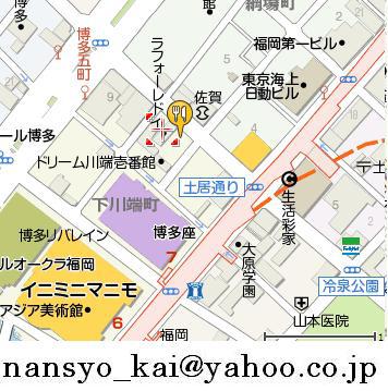 行き方 地下鉄中洲川端7番出口を出て博多駅方向へ、土居通り交差点を左に曲がって、約100メートル行った左側です。向かいは佐賀銀行です。
