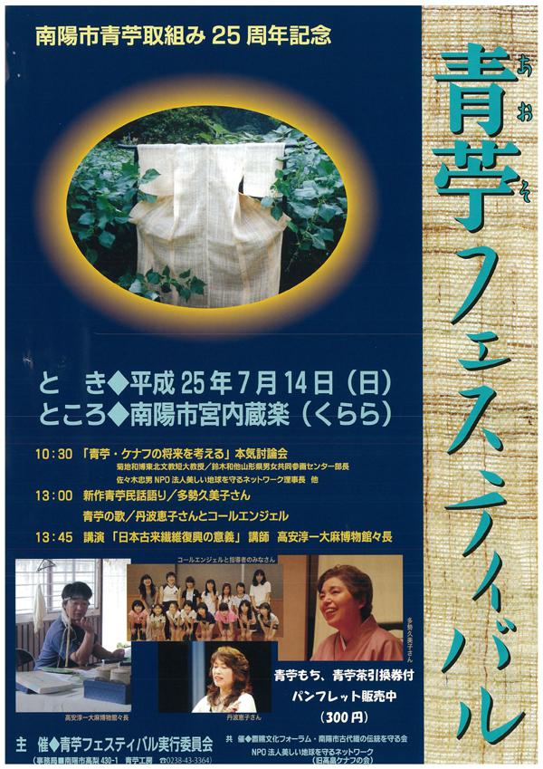 江戸時代に高級織物の素材として栽培され、特産物だった青苧(あおそ)文化の復興を目指す「青苧フェスティバル」が、南陽市交流プラザ「蔵楽」で開催されます。