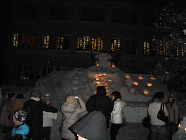 生徒たちが心をこめて作った雪灯篭・かねたん雪像・滑り台・電灯オブジェ…。