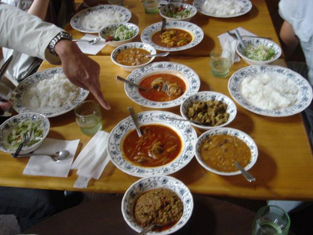 8月の末に長井のダ○ガリーというお店に7人で昼飯を食べに行ったときのこと、みんなでそれぞれカレーを注文しようとしたら、マスターが、せっかくだから7種類のカレーを食べてみない?と言って、7種類の多彩なカレーを出してくれた。民族的なカレーがずらると並ぶ。・・・うっうまい!!