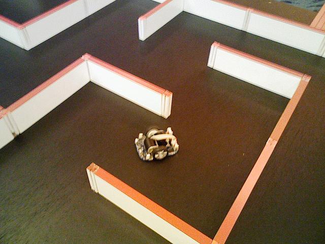・・・・かくいう、私のロボットは、まだ出来ていません(涙)時間がほしいよ〜!!ちなみに、製作途中のマウスを迷路においてみる。フル規格サイズの迷路に1/2規格のマウスは・・・ちいせぇ〜。体積は1/8だし(汗)でも。10月19日の東北大会にまにあうのだろうか!?