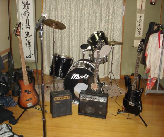 こ、これはライブハウスでしょうか?いやいやよく見ると着物が見えますな〜〜〜。ということはライブハウスではないようですな。これは正月家におけなくなった楽器(受験のため強制撤去)を別な場所に保管するためにもっていったのですが、どうせだったので一回全部セッティングしてみた時のひとコマです。実はここにたっつーさんのエレキも隠れています。ま〜よく集めたものだな〜と思いますわ。(すべて中古品)ということでした。