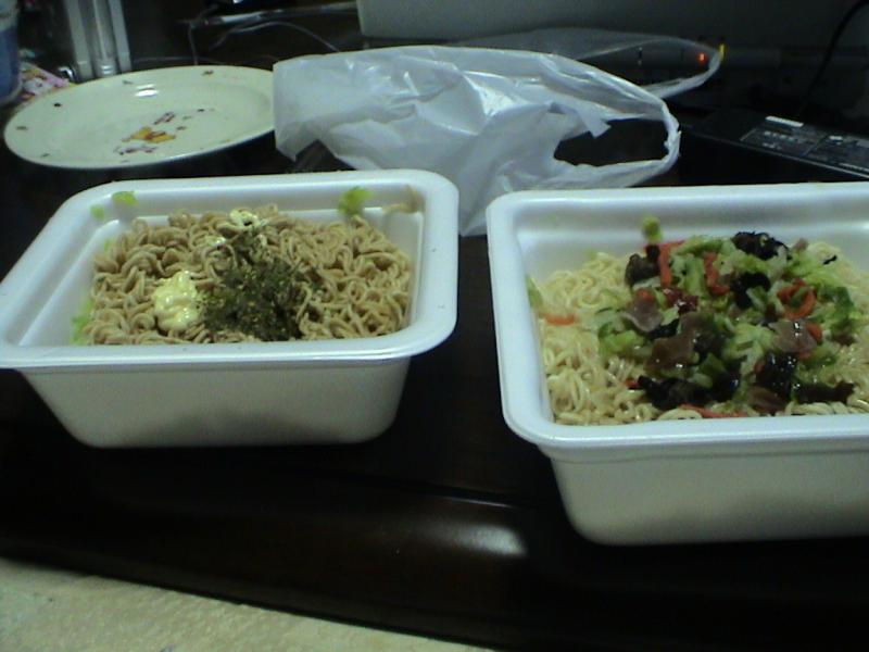 見てのとおり焼きそば食いまくりです。絵的にはあまりきれいではないのですが・・・あまり気にしないでください。ここで私は伝説を達成しました。カップ焼きそば3種類一気に制覇です。(そんなんでもないか・・・)なかでも『濃い焼きそば』は味が濃すぎ!!これにはスネ毛のこい伊○知○君(会長)もギブアップって感じでした。