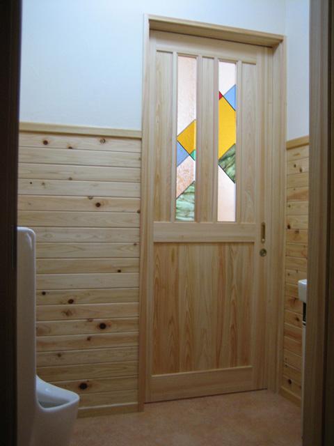 ここのドアは、トイレの入り口の片引き戸です。ステンドグラスが良い感じでとてもトイレの入り口とは思えないような感じです。