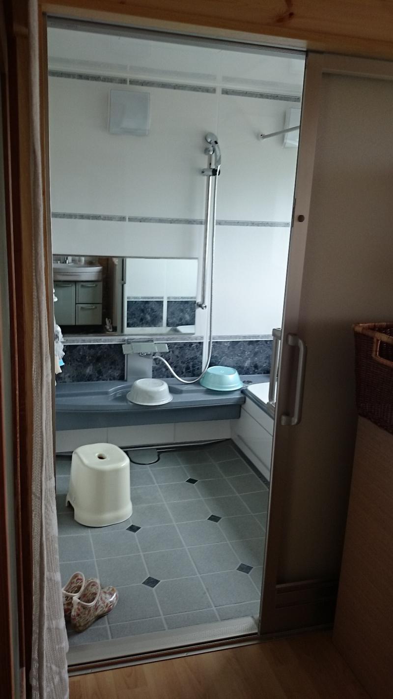 お風呂を、タカラユニットバスの浴槽がホーロー製のユニットにして段差解消と1,25坪の洗い場が少し広いタイプに、面脱衣も羽目板張りにして仕上げました