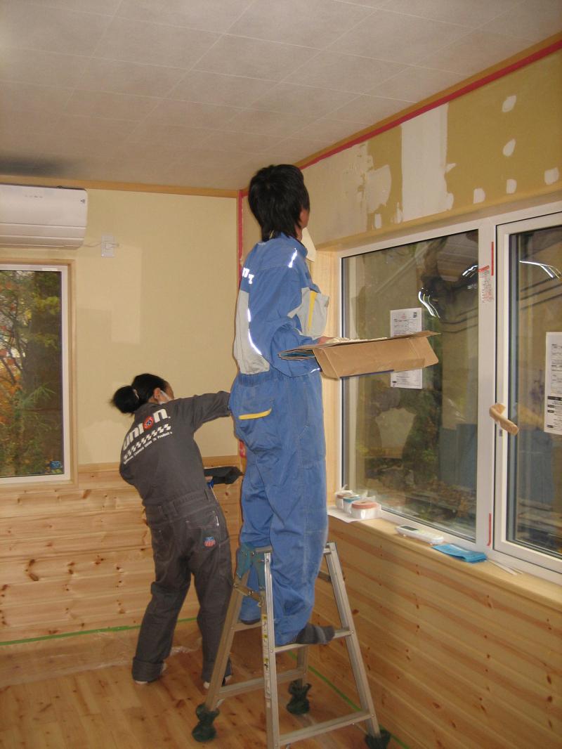 増築した部屋の壁に自然素材の塗り壁をお客さん自身が楽しみながらご夫婦で塗っています