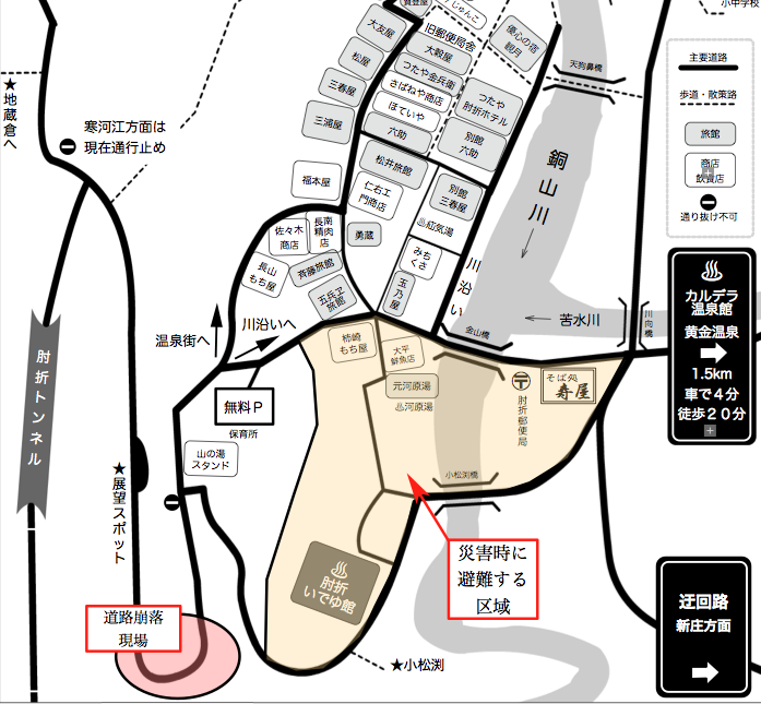 現在、道路の崩落により、肘折地区内の一部浸水も懸念されておりますが、