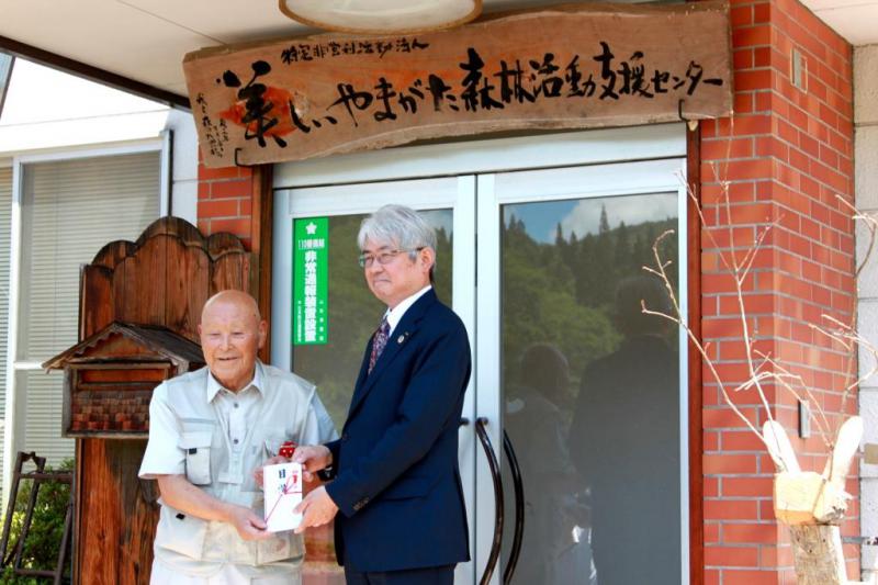 この春、2022年度の寄付先として美しいやまがた森林活動支援センターを選定いただいたとの連絡をいただき、7月26日、KDDI株式会社より阿部博則東北総支社長が当事務所にお越しになり、寄付金贈呈式を行なっていただきました。