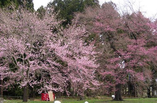 2つの桜を並べて撮影しました。樹の違いがわかるでしょうか。画面左の咲いている方が二世桜、右の濃いピンク色の枝を伸ばしている方が勝弥桜です。