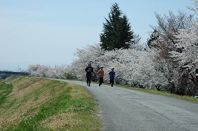 最上川堤防千本桜は満開、見ごろを迎えています。気持ち良く散歩やジョギングをされていました。