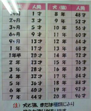 ペット屋さんに張ってあった年齢表です。