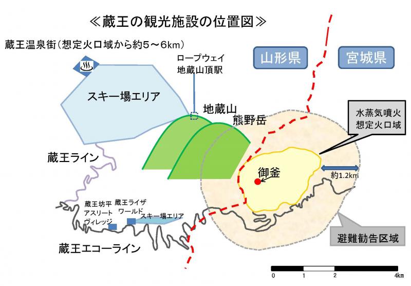 蔵王温泉街は、想定火口域から熊野岳と地蔵山の大きな山を二つ越え、約5〜6km離れたところにあります。