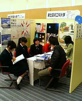 (画像は14日に福岡で開催された説明会の本学ブースの様子です。当日は生産デザイン学科の杉原先生、美術科彫刻コースの信時先生が参加いたしました)