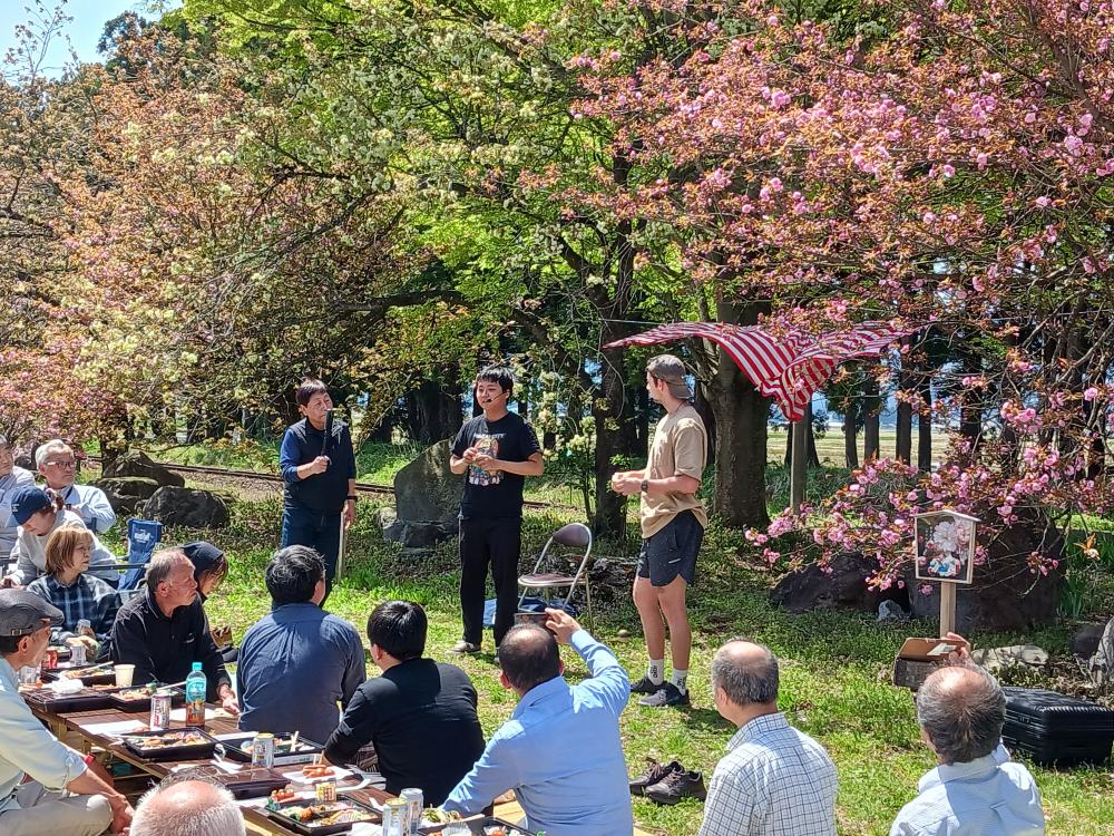今年は「泉米会」や「あう旅ツアー」の皆さんなど総勢60人を越えるごとになりました。アトラクションには、けん玉名人のパフォーマンスがありました。名人の後に、米屋さんが5連に挑戦。見事に成功して満場の拍手をもらいました。楽しいお花見会がスタートしました。