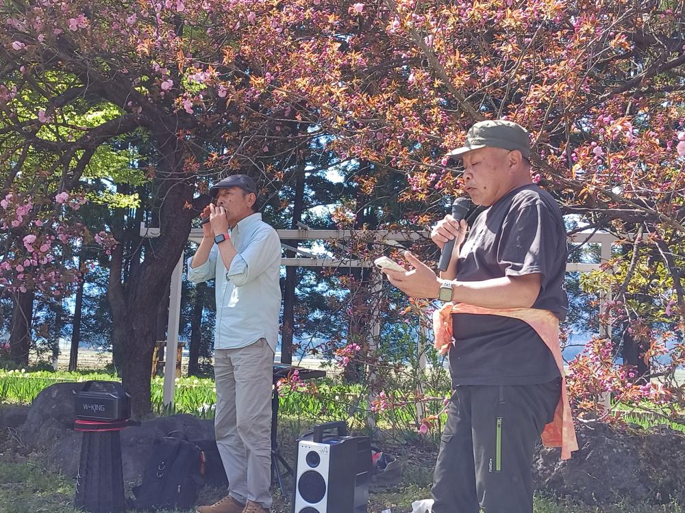 今年のお花見会には、参加された皆さんがそれぞれ楽しみ、会場を盛り上げてくれました。その一つがオカリナとの即席カラオケ大会です。オカリナは、金子俊郎さんが「BGM的に流すから」と演奏してくれていたのですが、マイクを持って歌ってくれる人が登場したのです。スマホで歌詞を見ながらのカラオケ大会は、今の時代の演芸大会の風景のように思われます。