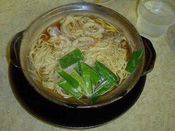女ご主人の話によると、鍋焼きの基本ルールは「付け合わせの漬け物と土鍋、鳥がらのしょうゆ味」だそうだ。麺をすすってややもしたら、中央に鎮座する卵黄をかき混ぜて食するのがご当地での食し方とレクを受けたあと、一気に立ち向かう。見た目よりアッサリしてイケル、未知との遭遇「まいう〜」でした。