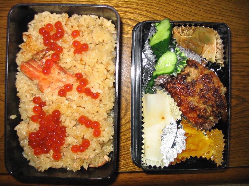 この季節はやっぱりはらこ飯食べたくなります。はらこ飯は、宮城県亘理町に伝わる郷土料理、昆布でだしをとって、薄口醤油・みりん・甘塩鮭鮭の身で炊いたご飯にイクラ(はらこ)の上に乗せたもの…今日のお弁当は「はらこ飯弁当」 です、ヤッター(笑)。でも、いくらなんでもイクラ少ないと思いませんか?お前の稼ぎが少ないからだって?トホホ…。
