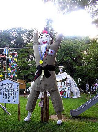 祭りは、旧県立上山農業高校の文化祭イベントの一つとして開いたのが始まりとか、 祭りには、小泉純一郎かかしや環境問題をテーマに、空のペットボトルで造った「ぼくらのゴジラワールドかかし」、中には、景気回復を願って「不況を吹き飛ばす百万円札かかし」が登場し人目を引いていました。写真は、ヤワラちゃんかかしだってよ?どう見ても似てないよ〜。