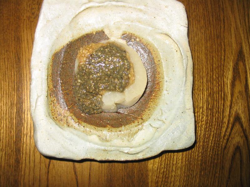 “ふろふき”は、材料が大根と味噌だけのシンプル料理だけに細やかなの心づかいが必要となるとか。先づ肌理の細かい大根が良く、更に器にも気を配りたいですねえ。中味が冷えないように、ふと器に手が触れた時に温かさが感じられる様に、必ず盛り込む寸前に器を温めてあればサイコーですが、そこまでの要求は今の力関係でムリです、あちゃー。フツウはみそだれですが、ごまだれもかけて見ましたが、みそとゴマが入り混じってビミョーな味覚でした。