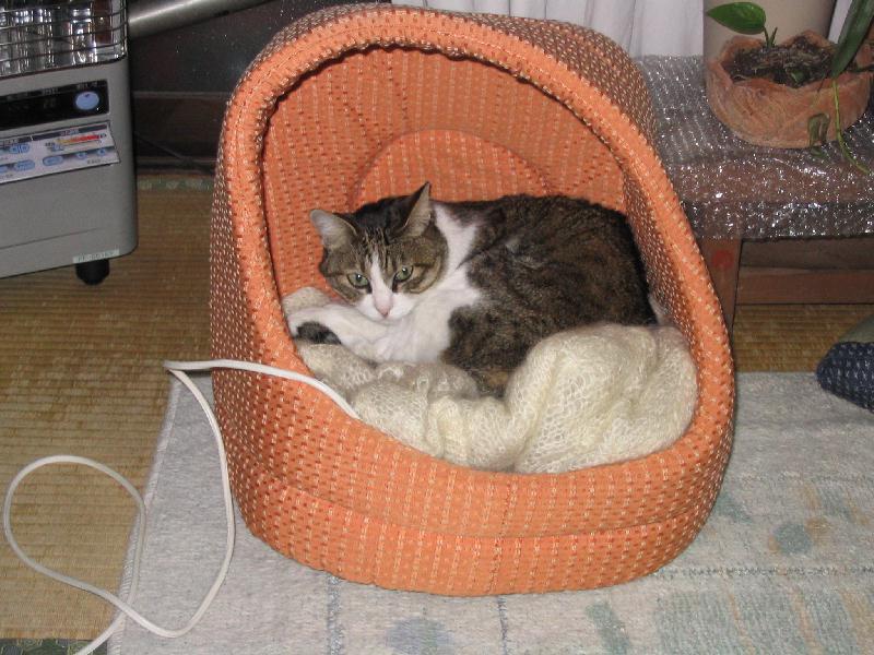 我輩を拾い上げたのは、ボスの息子だったと後でわかった。すでにボス宅にはキジトラの長女が居座っていた。つまり我輩は二女ということになる。ボスの主人は、最初我輩がいることを知らずに家に帰ってきて、大変びっくりしていた。ボスとは主人の細君だが、この家の最高権力者なので、我輩としても一目置かざるを得ない。ボスの我輩に対する態度は、俗に言う猫かわいがりである。猫にも一宿一飯の義理はあるので、この度の主人の頼みは引き受けたが、元来は寝るのが仕事で、えさ食べる時以外はほとんど寝ているのだ。おっとー画像に写っているのが我輩のベットで、この時期はアンカが話せない、今日のところはこれまでニャ。