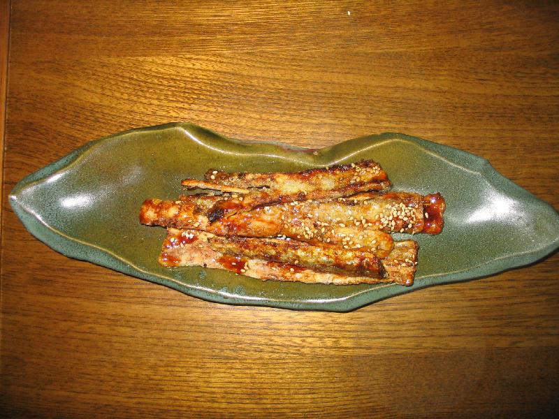 これはなんだか分かりますかね?うなぎパイ?ブブッー、これは「ごぼうせんべい」とでもいいましょうか、エンゲル係数の高い我が家で考案したオリジナルおやつレシピ一品です。縦長にスライスしたごぼうを油でからっと揚げたものに砂糖醤油で味付けしただけのシンプルなものですが、これがごぼうとは思えない食感で、繊維質も残らずまったく別もんのように仕上がっています。