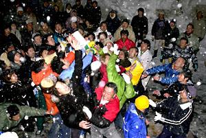 ご利益をつかもうと必死の男性たちはご神体めがけて一斉に飛びついた。雪まみれになりながら数人が路上でもみ合う光景も、怒号の飛び交う中、あちこちで激しい奪い合いを繰り広げた。その迫力たるや、プロレスのバトルロイヤルをほうふつさせるもので、中には血をにじませながら死守する若者も…。子宝にはとうの昔必要のなくなったワタクシは、遠巻きに見入るしかありませんでした(笑)。