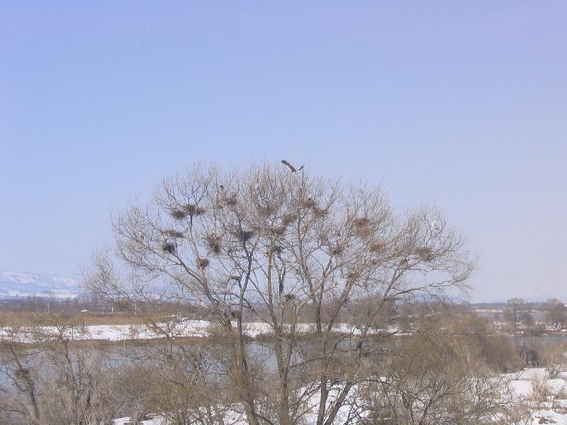 これまでも時たま、川辺で小魚捕りをしている姿を見かけてたので、この辺りに自宅マンション?があるとの想像はついてましたが、ついに発見!夏は葉っぱに覆われて気づきませんでしたが、なんと過密住宅のような満室状態ではないか。これから繁殖時期に入るそうで、せっせと巣作りをしていました。偽装耐震で揺れ動く人間社会をよそ目に、鳥類の世界ではこの程度の過密は大丈夫なのかも…あおさぎはコロニー(集団繁殖地)をつくることが多いと聞いていましたが、正にそのとおりでした。