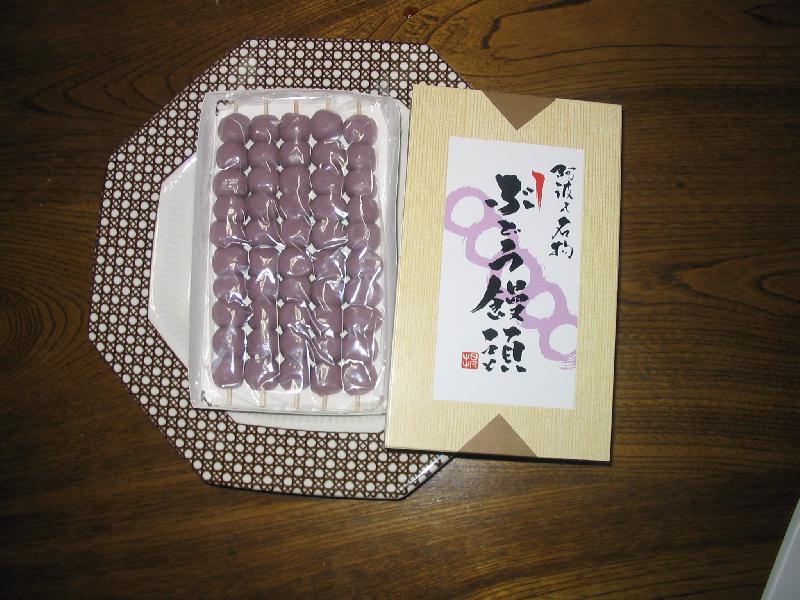 そうそう味の報告忘れておりました。饅頭というより「ぶどうあんこ」をだんご状に刺したものといったら近いかな?お茶とよくあいますよ〜。季節限定ですが、抹茶ミルク風味のぶどう饅頭もあるようですよ。