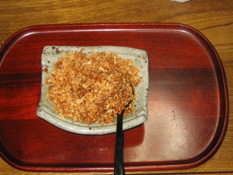 たなごめは、@鍋に砂糖、しょうゆ、みりん(水あめも入れる家庭もあるようです)をこがさないようにかきまぜながらアメ状に煮詰める。A別に、フライパンで干したご飯をふっくらと炒りつけるB炒ったご飯に@を絡めてかきまぜて1丁上がり。