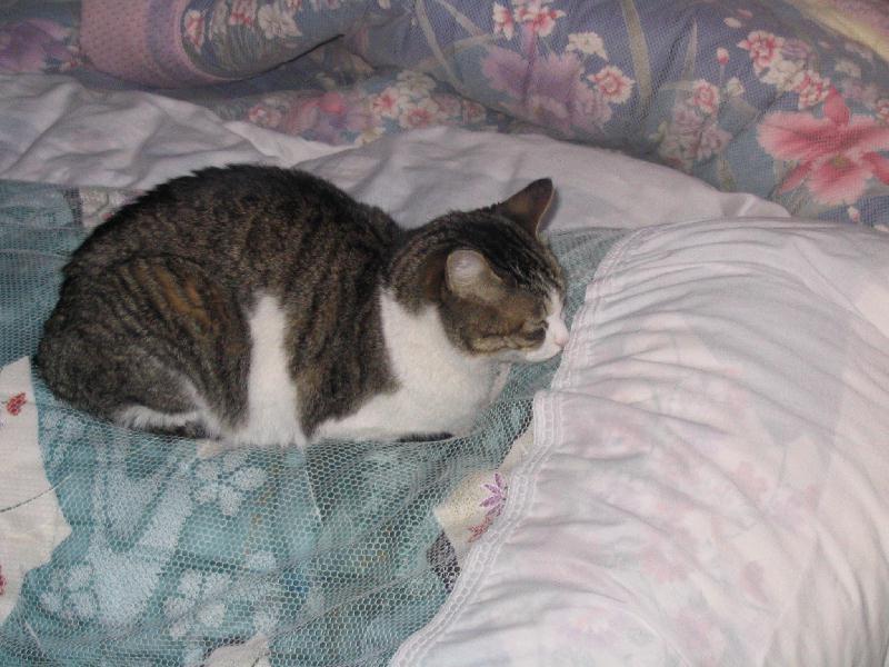 初期のトリオコント・ブームで一斉風靡したナンセンストリオのギャグ「親亀の背中に小亀をのせて〜、小亀の背中に孫亀のせて〜、孫亀の背中に曾孫亀のせて〜、親亀こけたらみなこけた」じゃあ〜りませんが、我が家のネコのお気に入り場所がカミサンの布団の上。それなりに肉の付いた背中は、ネコにとってもフランスベッドのようにクッションがいいのかもしれません。
