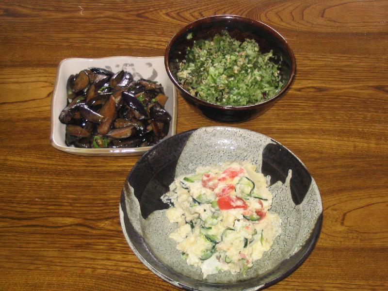 けさの朝食メニューは、ポテトサラダ、ナスのきんぴら、だしのヘルシーなもの。これに使用したじゃがいも、トモト、きゅうり、ナス、しそ、みょうがetcは、すべて家庭菜園でとれたもので自給自足100%メニューでした。自給自足といえばタダ、しかももぎたては新鮮でまいう〜、管理は大変だけど家庭菜園やめられませんな。