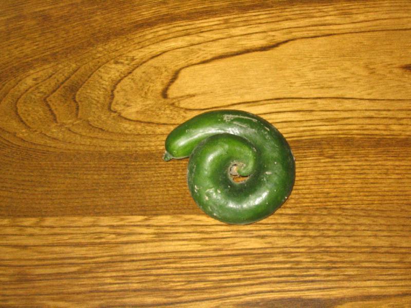 これは、ウチで取れたキュウリ、残暑でキュウリも伸びる方向を間違ったのでしょうか、とぐろを巻いている姿は何かにも似てるような…。毎朝おなじみのウ○コちゃん、イメージするものがモノだけに、さすがに食うには躊躇しましたw。でもオモロイので載せる。